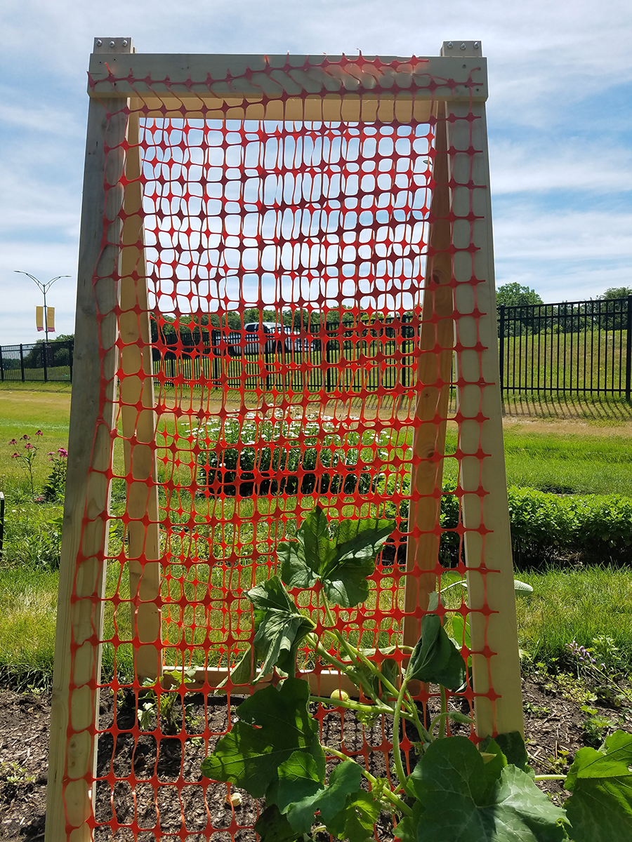 Hello again! For this blog post, I’d like to talk about my leadership project. This summer, I have been working on creating trellising systems for tomatoes, watermelons/pumpkins, and kale/mums. The overall goals for these trellises is to make harvesting easier on both us and the plants, require less human labor to install and maintain, and even to prepare plants for a future display (kale and mums need a little extra help to grow vertically). With my professional interests in sustainability and international development, I wanted to create these trellises using low-cost, repurposed materials that could be accessed on a mostly global scale. Thus, here I am, introducing trash trellises! The trellis pictured above is made of scrap plywood and snow fence I quite literally found on the ground! So far, one A-frame trellis structure for the cucurbit crops (as pictured above) is installed with a second one soon to follow, and the kale and mums trellis made of PvC pipe and trellising netting will be installed later this week. For the tomatoes, half are currently trellised using leftover round cages and the other half will eventually be trellised with a hanging system made of PvC pipe, twine, and bread ties.